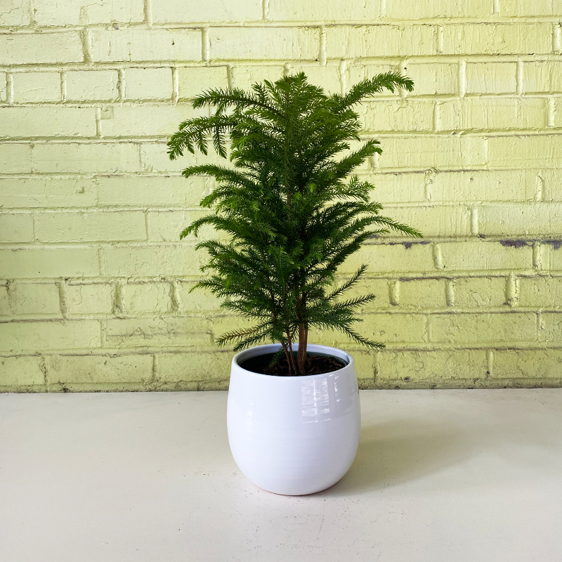 With its broad sprays of delicately needled branches and soft texture, this tropical native from a small island in the South Pacific brings an evergreen conifer look to your houseplant collection. Although not a true pine, it is easygoing and forgiving, and will slowly develop a woody trunk and sturdy branches. Refrain from pruning the growing tips as there will be no new growth and repot only when completely rootbound. Araucaria heterophylla