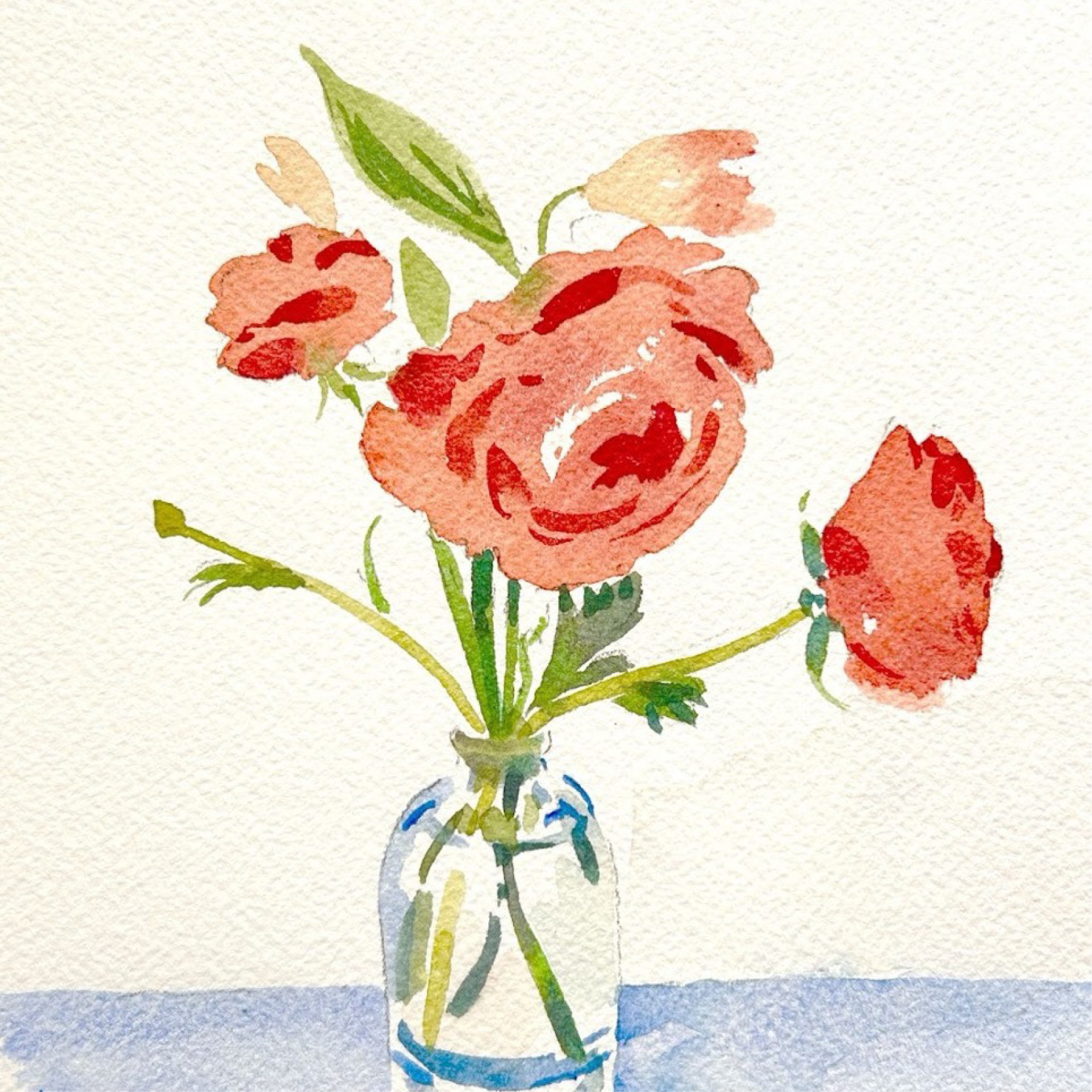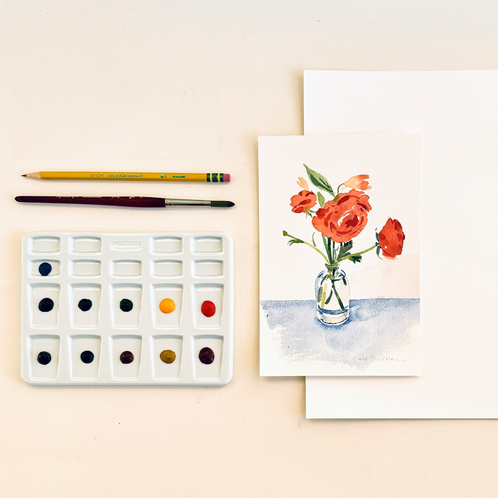 Explore the art of watercolor painting with artist Caitlin Allen. In this class, students will learn basic watercolor mixing and brush techniques to create a vase of ranunculus. Caitlin will guide the class through practice exercises and share her tips for finding success with the medium. All supplies are provided, and you will leave with a completed painting on premium watercolor paper. This class is great for beginners and those who have worked with the medium before.