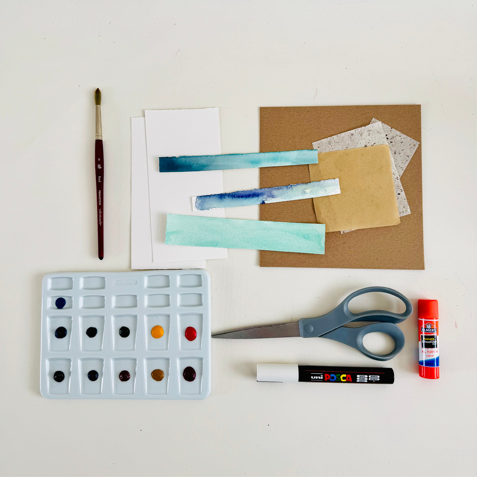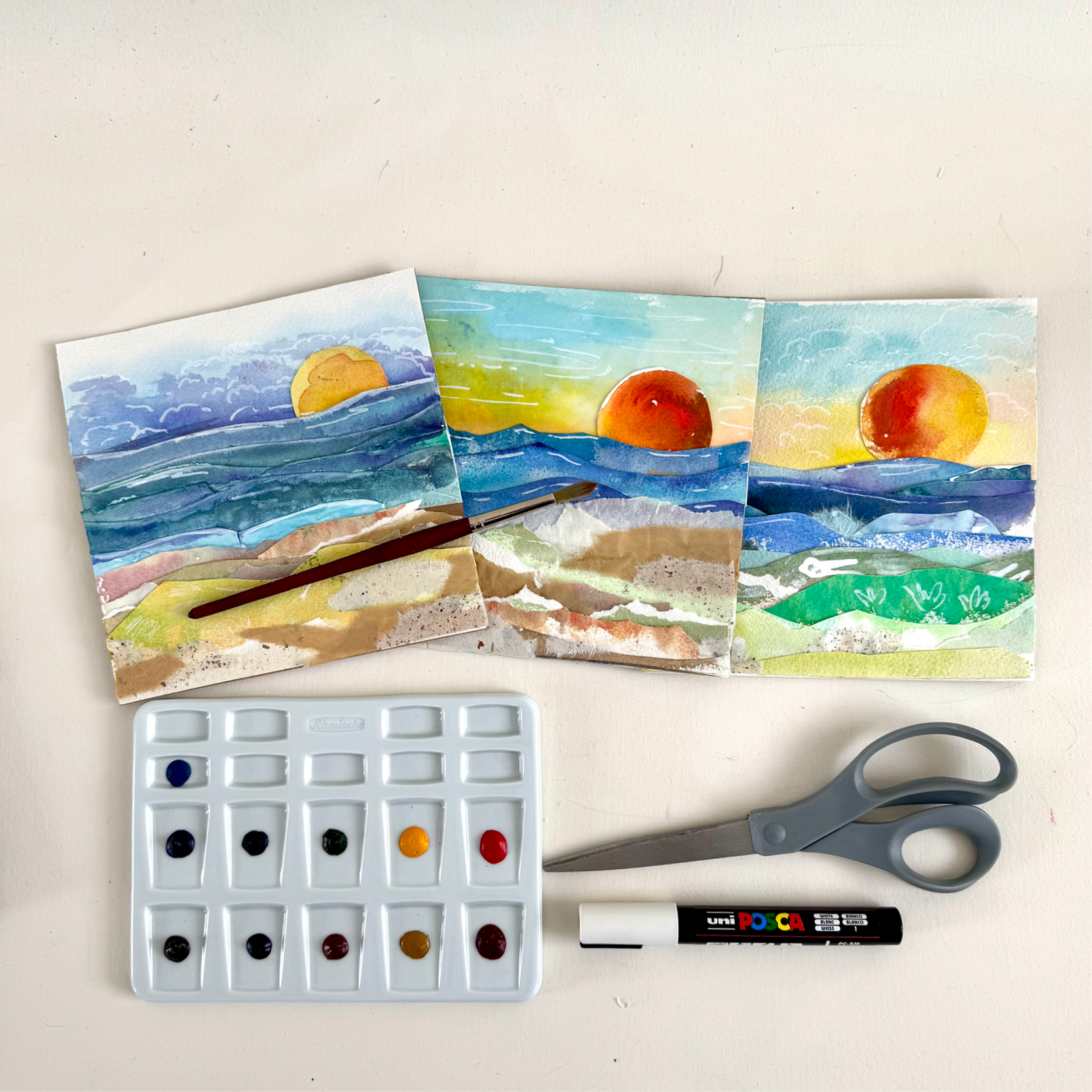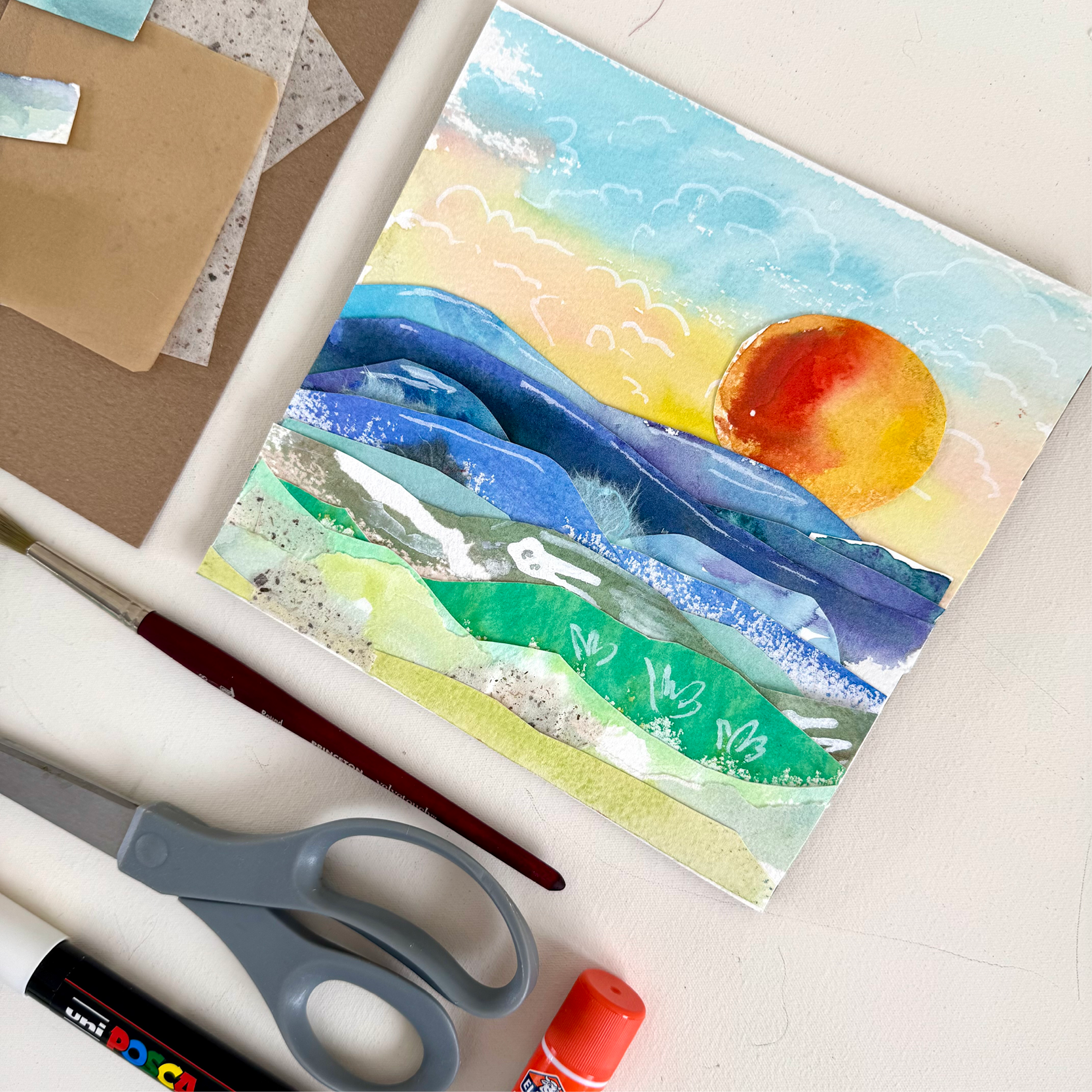 Combine painting and collage to create a colorful seascape. You will use watercolor paints, mulberry and watercolor papers, and Posca pens to create a textured composition. Then, you will cut and paste your pieces together to evoke a colorful, layered seascape with depth and movement. Holly Rogers will teach you her collaging methods and show you how to get creative with scraps to make collages that are both beautiful and resourceful. Students will leave with a completed seascape that is ready to frame and admire.